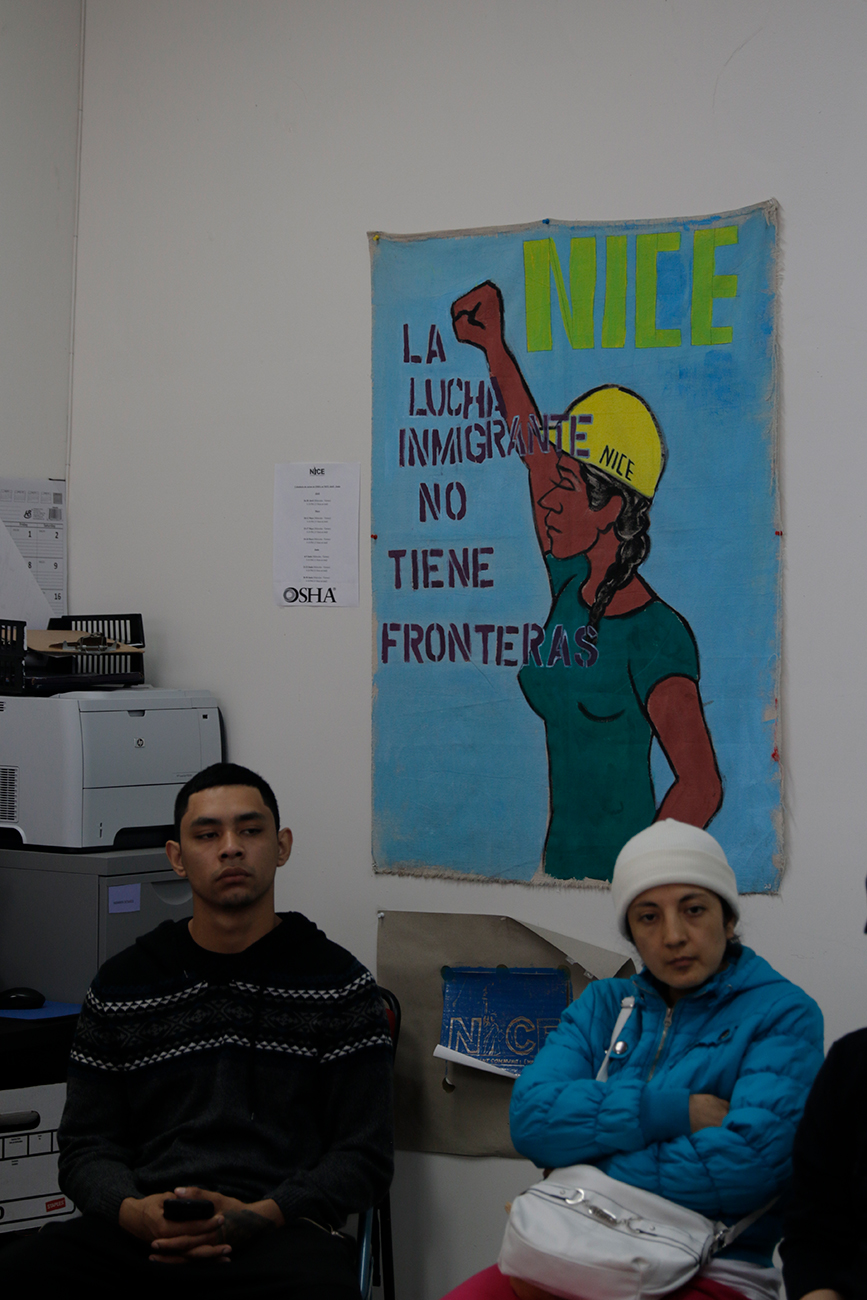 Es primero de mayo, el día del trabajo, un par de cuadras más arriba de la 69 en Queens. Alrededor de 16 jornaleros se reúnen a las 7.30 de la mañana en las oficinas de NICE. ¨Antes que nada buenos días y felicidades por el día del trabajo internacional. Hay que tener trabajo con dignidad, tenemos que buscar tener siempre trabajo con dignidad," comenta Eduardo Redwood, ex militar ecuatoriano y dirigente de NICE.